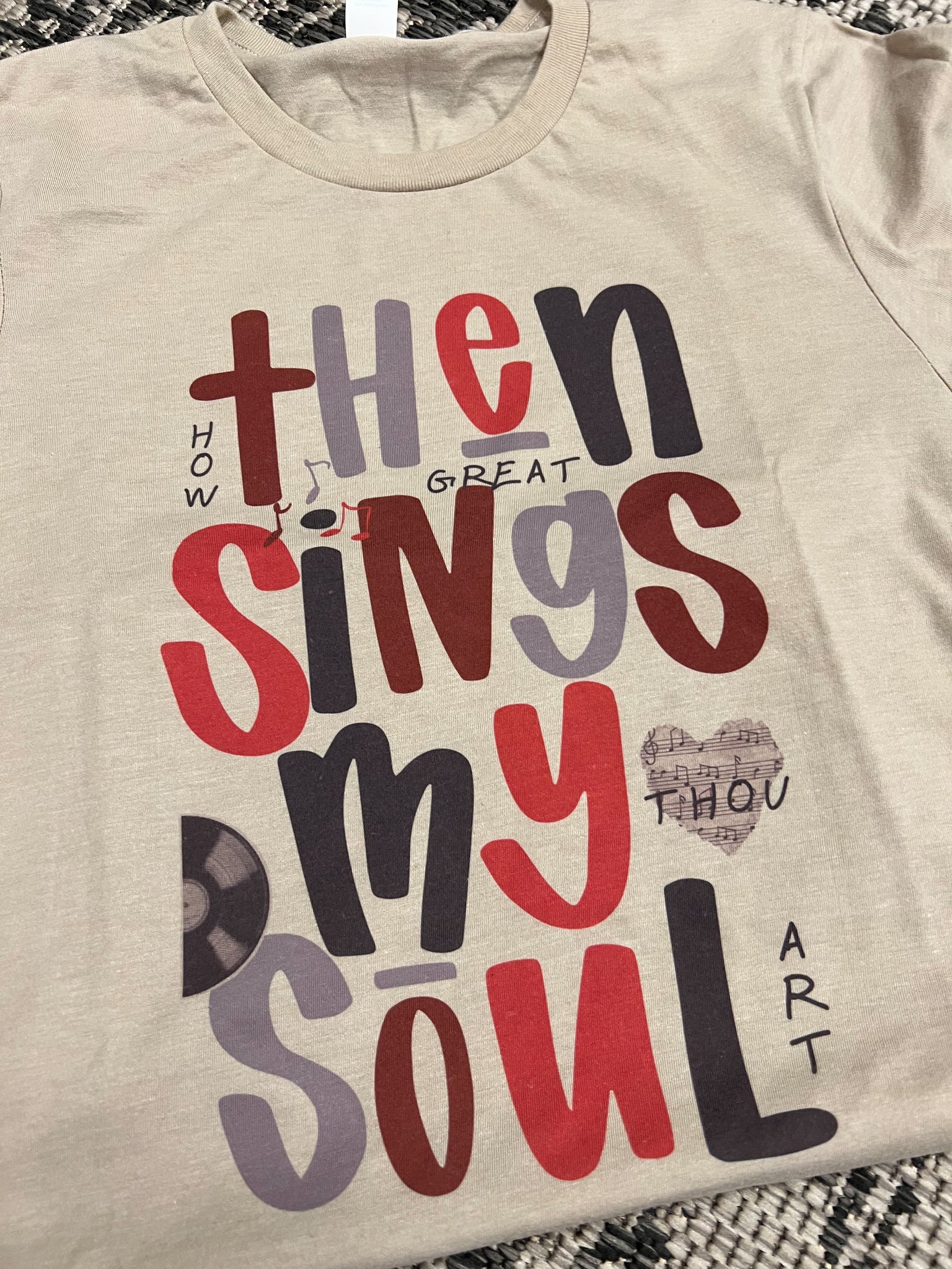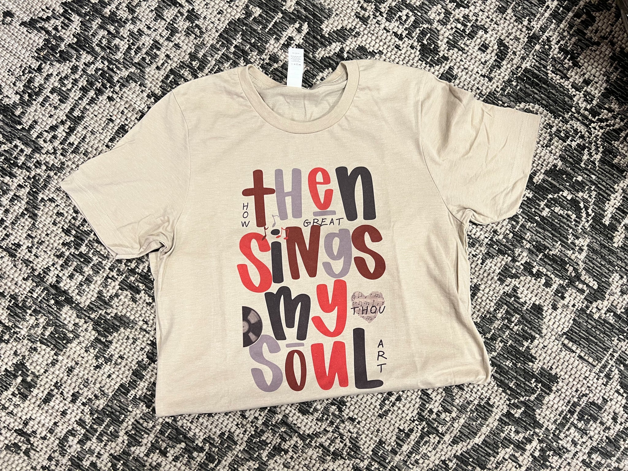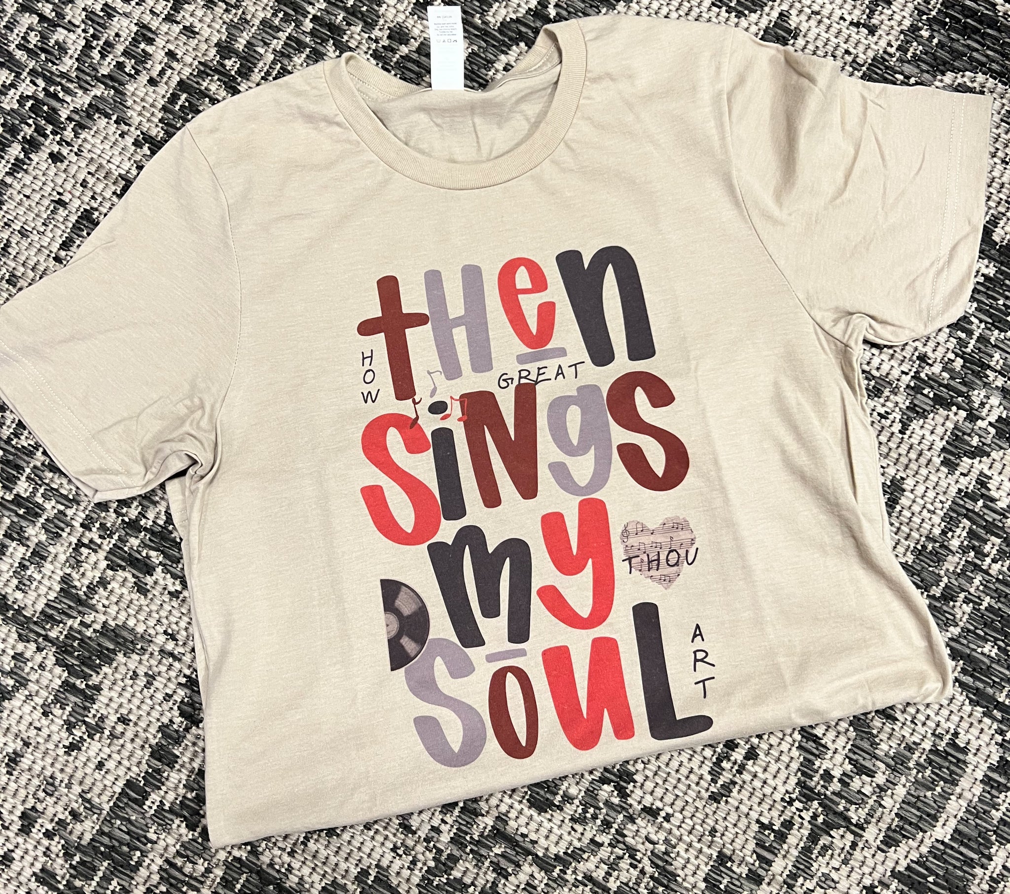 Unisex fit; runs slightly large (in short-sleeve tee; recommend sizing down one size if between sizes in this option); sweatshirt true-to size; 50/50 blend; tan shirt with berry colors print.